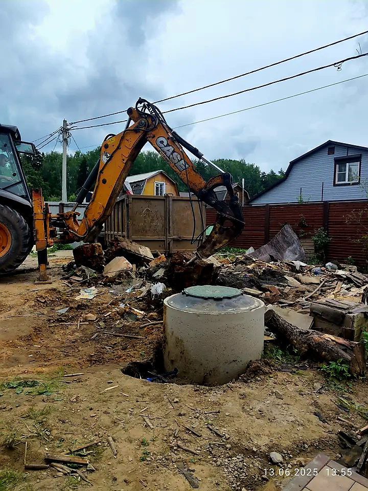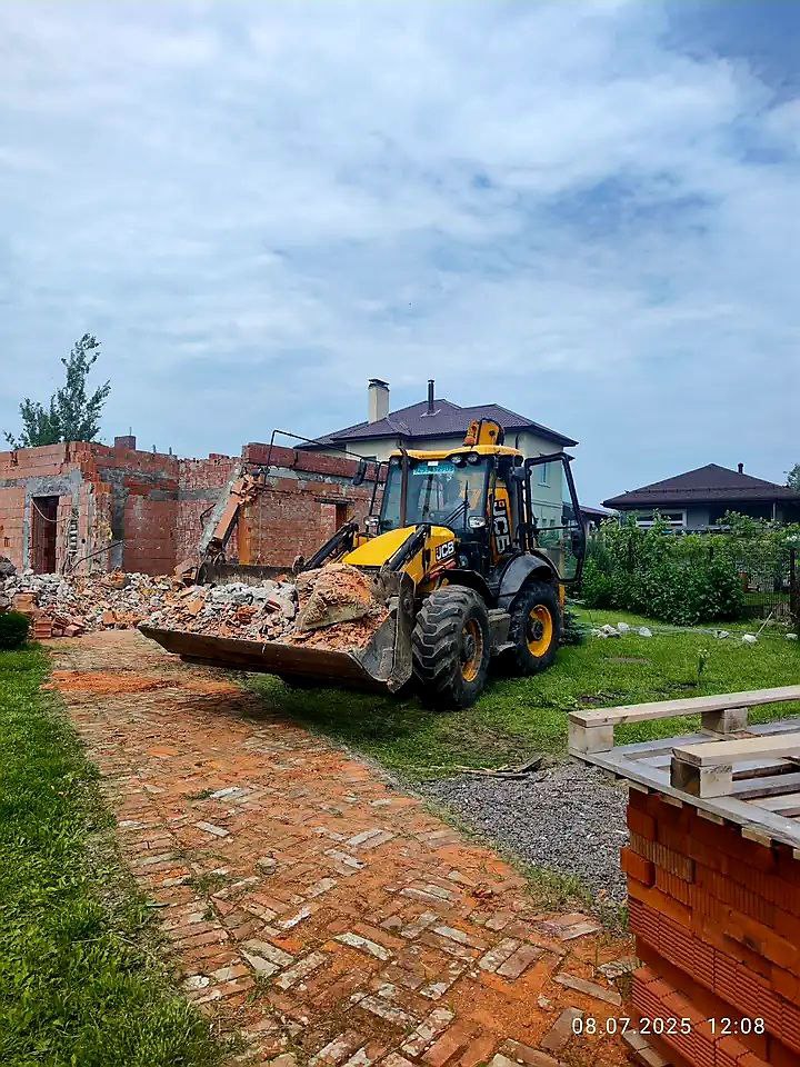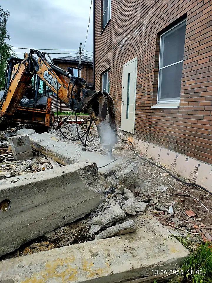 Выполнили механизированный снос кирпичного дома площадью 250 м². Спецтехникой демонтированы стены, полностью разобран фундамент, удалена подушka основания. После завершения демонтажных работ выполнена разработка котлована под будущий фундамент, что подготовило участок к следующему этапу строительства. Работы проведены быстро, безопасно и в соответствии с нормативами. 2.